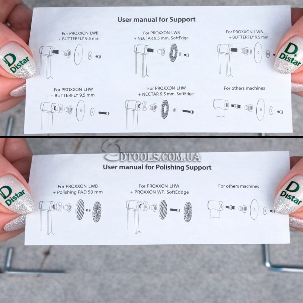 Mechanic Support устанавливается напрямую на граверы Proxxon и подходит для моделей LWB, LWH, WP и аналогичных. Адаптер рассчитан на работу с отрезными дисками Butterfly, Nectar, Soft Edge 45, а также с фрезами для гравера с посадочными отверстиями 5,8 мм и 9,6 мм.