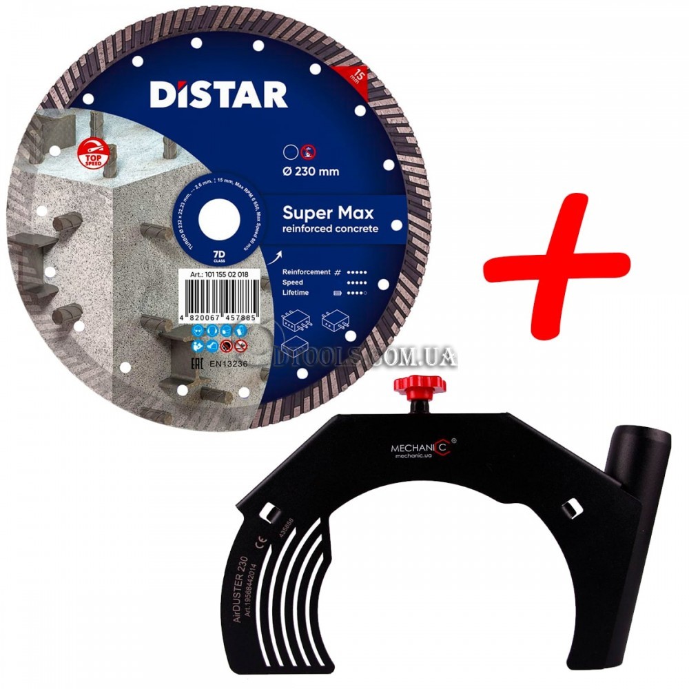 Рекомендуем купить набор диск по армобетону Distar Super Max 230 и пылеотвод на УШМ Mechanic Duster 230